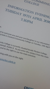 The information evening for parents and students who are enroling in Clonturk CC in September 2016 will be held on Tuesday, 19th April 2016 at 7.30pm. Invitations are in the post! We look forward to welcoming all our 1st year students and their parents 🙂